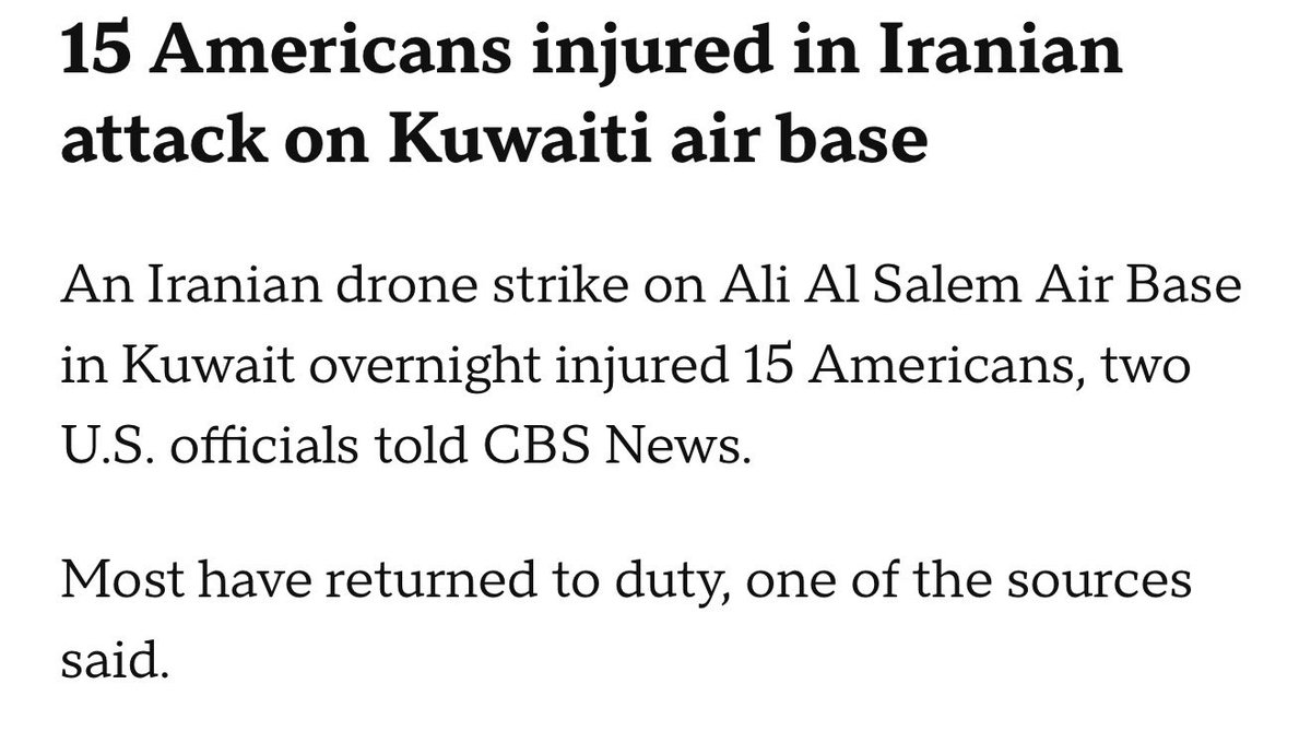 🚨 An Iranian drone strike on Ali Al Salem Air Base in Kuwait overnight injured 15 Americans -CBS