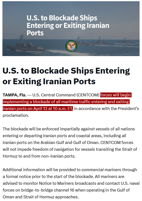 JUST IN - CENTCOM announces that a blockade of all maritime traffic entering and exiting Iranian ports will begin on April 13 at 10 a.m. ET.
