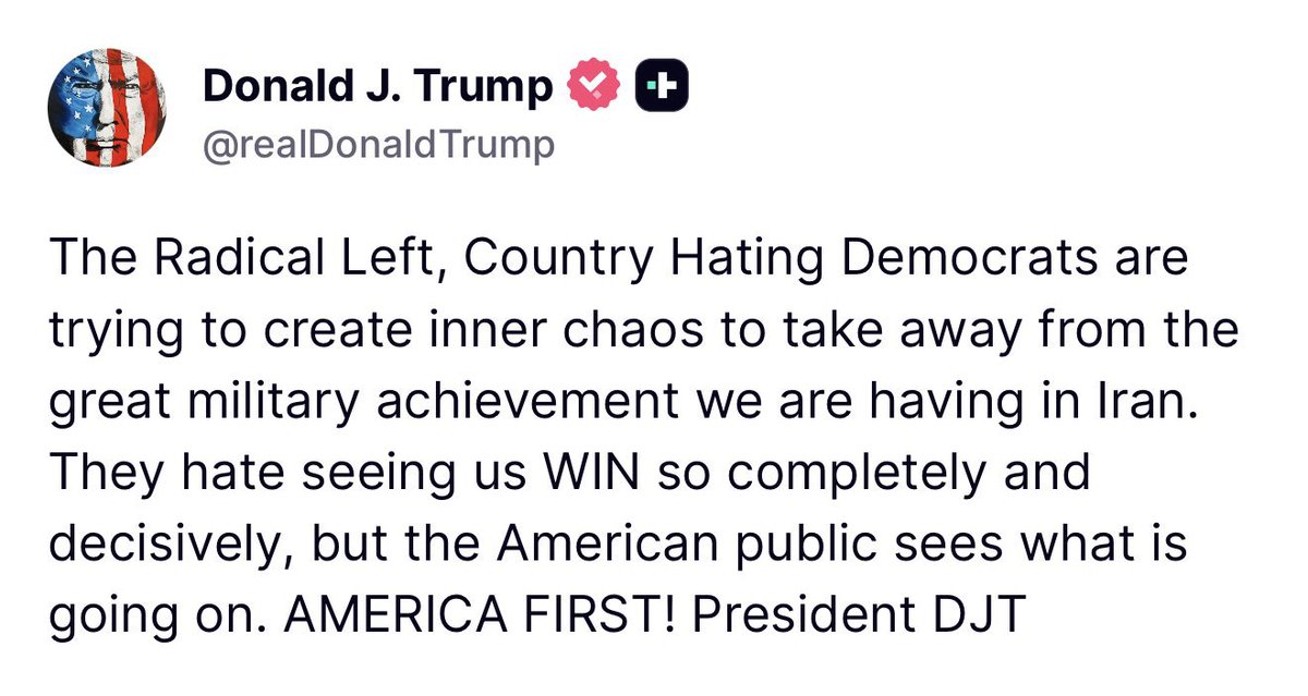 🚨 TRUMP: The radical left, country hating Democrats are trying to create inner chaos to take away from the great military achievement. We are having in Iran. They hate seeing us WIN so completely indecisively, but the American public sees what is going on. AMERICA FIRST!