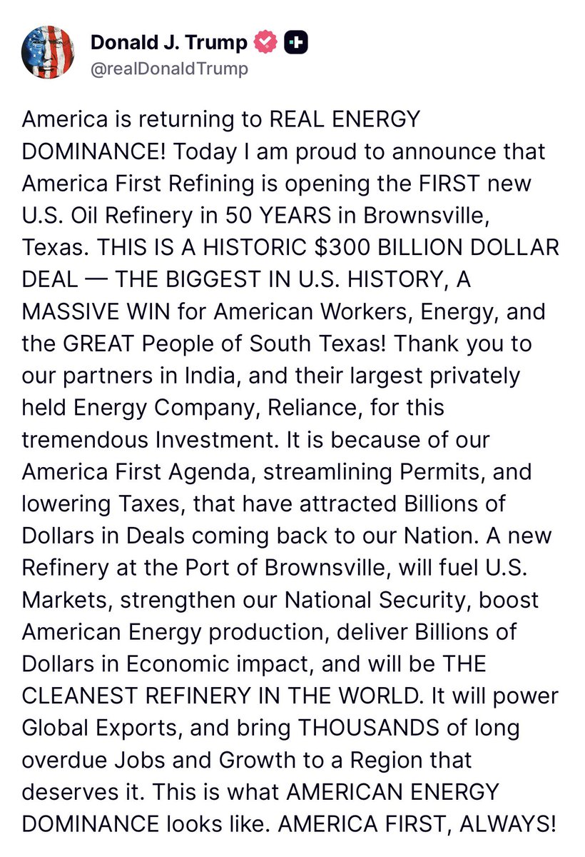 President Trump announces America First Refining is opening the first new U.S. Oil Refinery in 50 years in Brownsville, Texas.