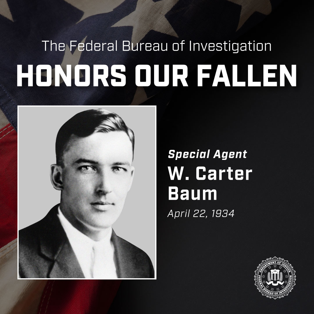 The FBI honors Special Agent W. Carter Baum, who was killed by gangster "Baby Face" Nelson on the day in 1934. Baum was among a group of agents who were following up on a tip about the whereabouts of John Dillinger and members of his gang. https://t.co/eUrTfnXnTY