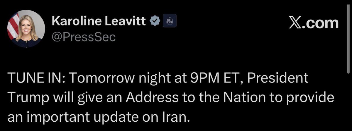 🚨 BREAKING: WH Press Sec. announced that President Trump will deliver an important update on Iran in an address to the nation tomorrow at 9 p.m. ET.