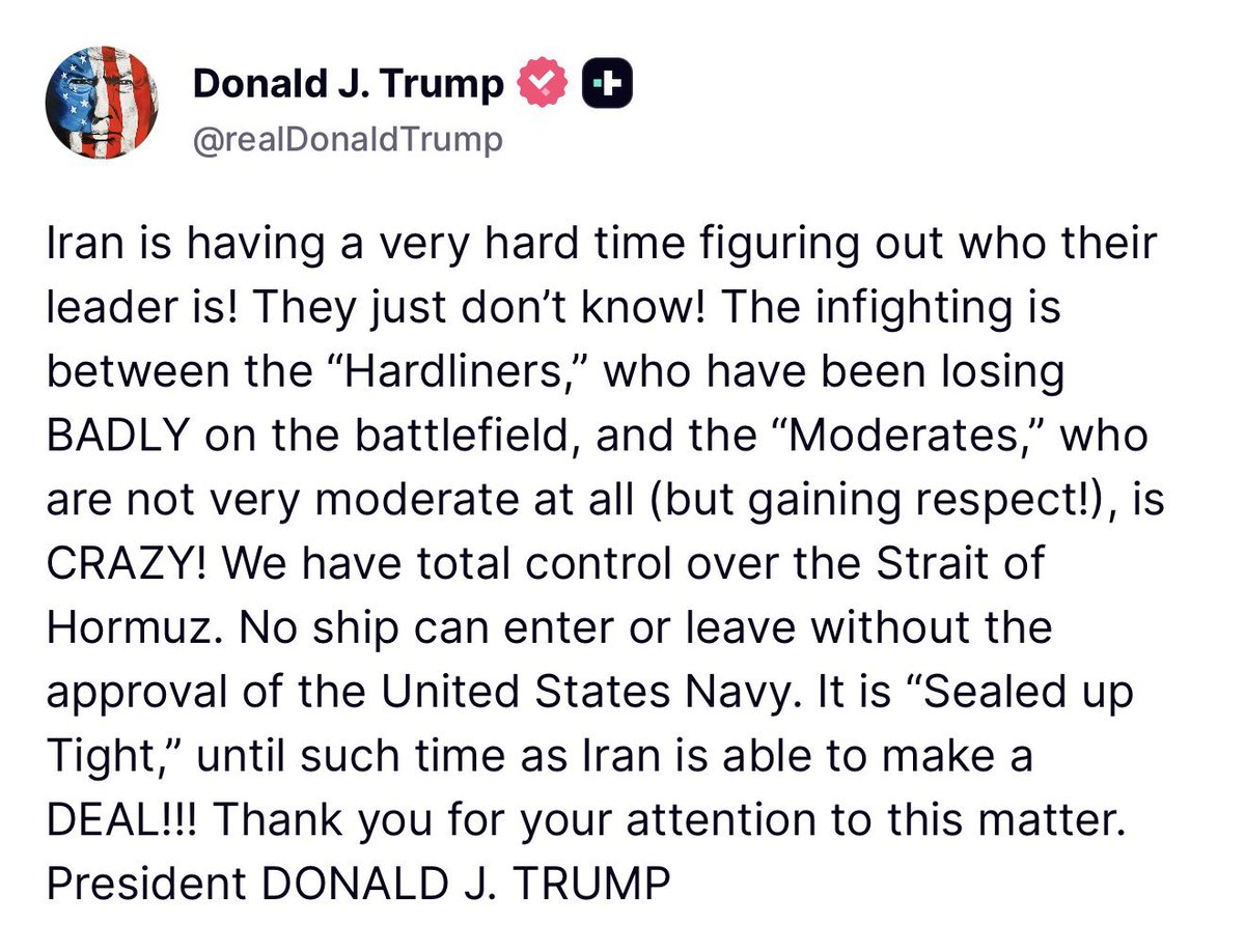 TRUMP: “Iran is having a very hard time figuring out who their leader is! They just don't know! The infighting is between the "Hardliners," who have been losing BADLY on the battlefield, and the "Moderates," who are not very moderate at all (but gaining respect!), is CRAZY! We