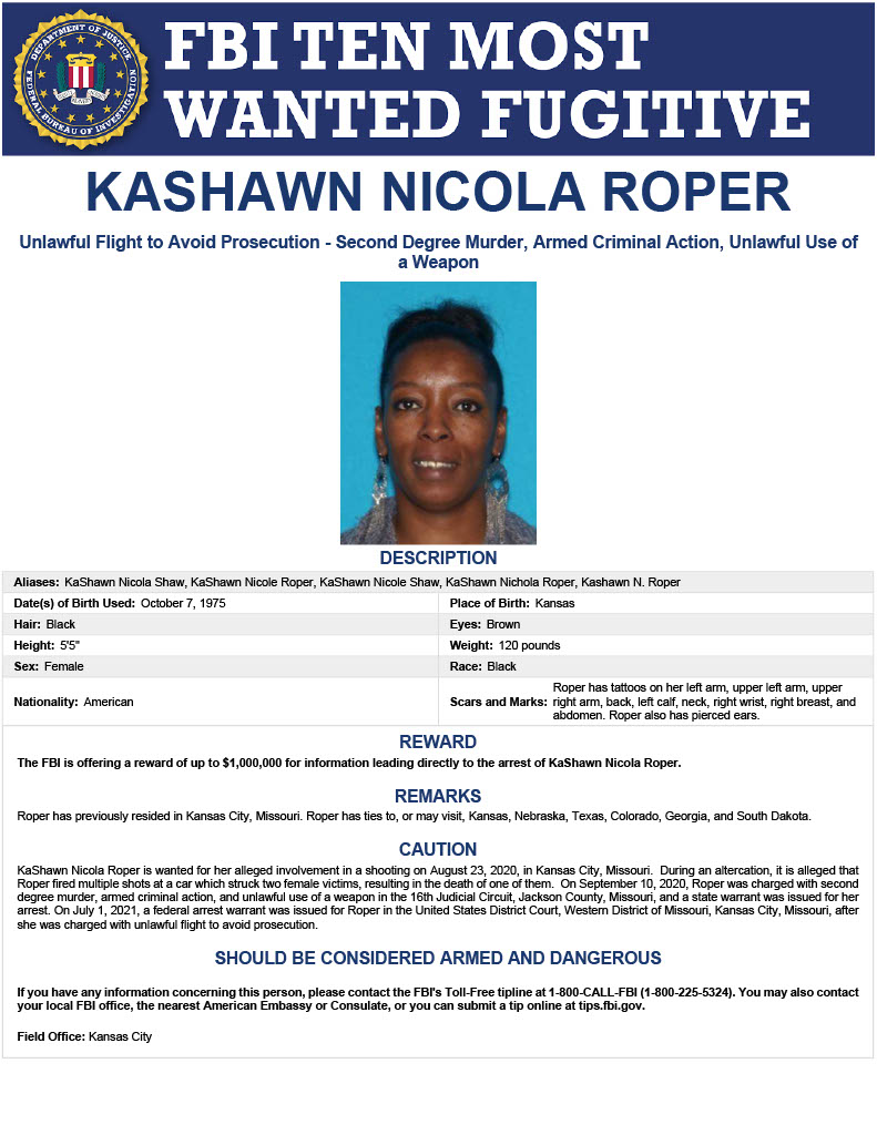 🚨Addition to the FBI’s Ten Most Wanted Fugitives list out of @FBIKansasCity: KaShawn Nicola Roper has just been added to #FBI Ten Most Wanted Fugitives List. The #FBI is offering a reward of up to $1 million for information leading directly to her arrest. Roper is #wanted for