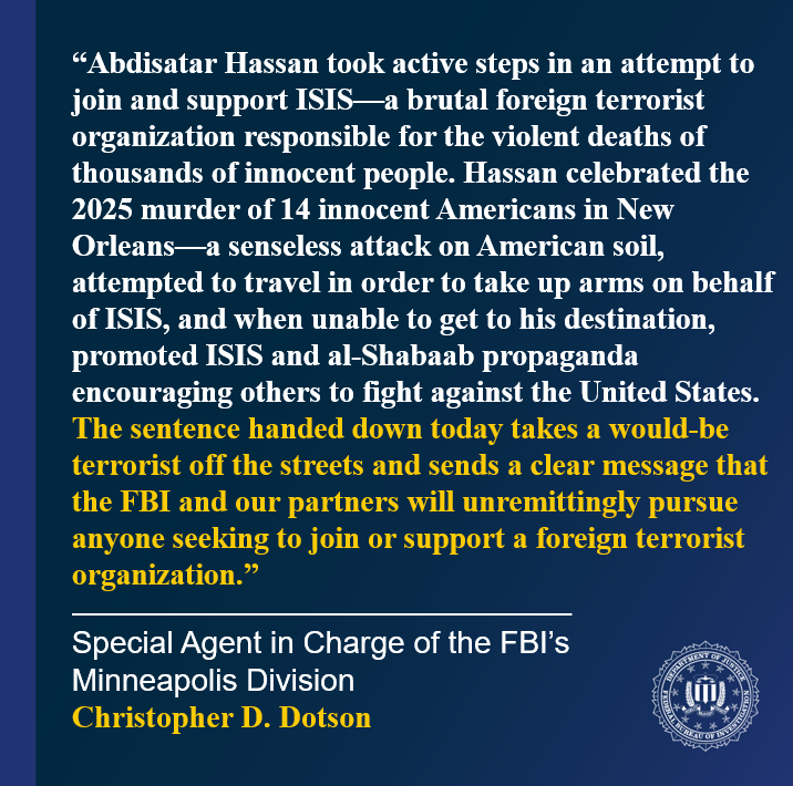 CASE UPDATE from @FBIMinneapolis: Man Sentenced to 8.5 Years for Attempting to Provide Material Support to ISIS According to court documents, Abdisatar Ahmed Hassan, 23, had frequent and extensive social media communications with ISIS media wings and recruiters operating in