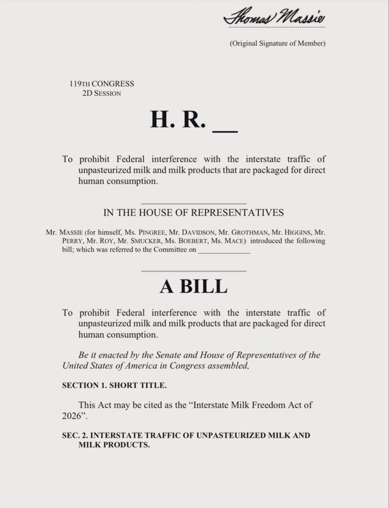 I just reintroduced the Interstate Milk Freedom Act, HR 7880 with @chelliepingree. The bill prevents the federal government from interfering with the interstate traffic of raw milk products between states where distribution or sale of such products is already legal.
