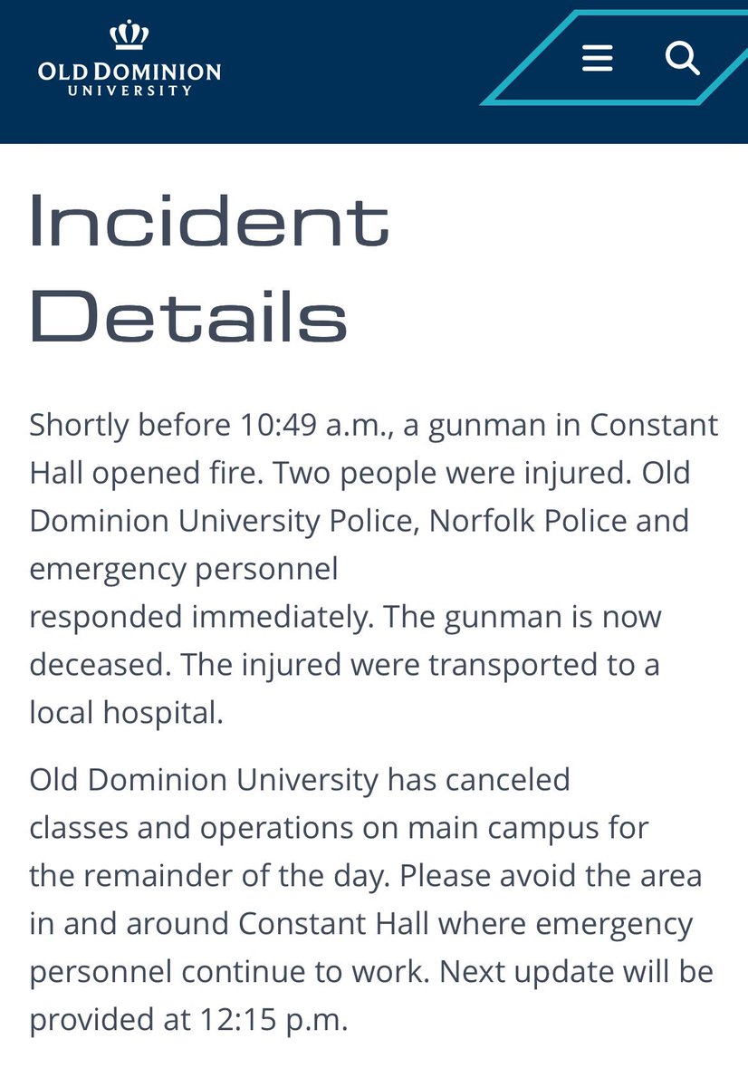 BREAKING: Old Dominion University in Norfolk, Virginia, confirms an active shooter incident has ended with one gunman killed and two people injured.
