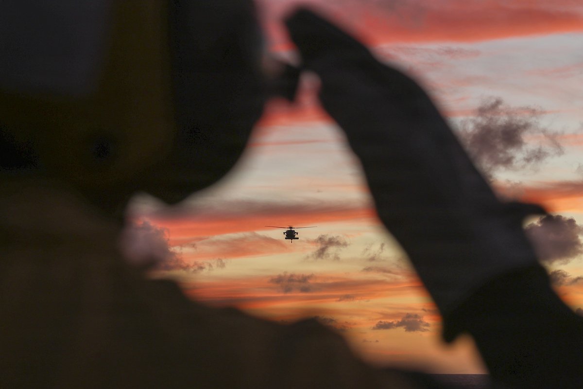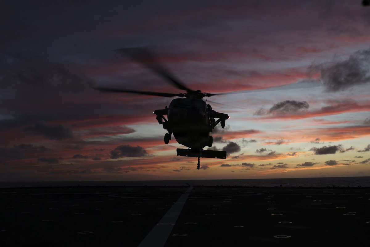 Low light. High Standards. A Boatswain’s Mate, assigned to Whidbey Island-class amphibious dock landing ship USS Comstock (LSD 45), directs an approaching MH-60S Sea Hawk attached to Helicopter Sea Combat Squadron (HSC) 21 on the ship’s flight deck. Comstock, part of the Boxer