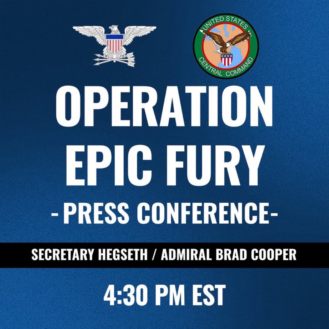 🚨 Sec. of War Pete Hegseth will conduct a joint briefing with CENTCOM Commander Admiral Brad Cooper at 4:30 P.M. today.