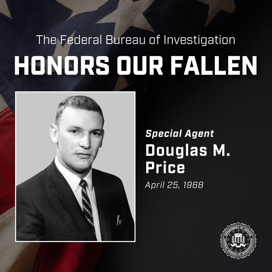 The #FBI honors Special Agent Douglas M. Price, who was fatally shot on this day in 1968 during a Bureau operation to apprehend a fugitive who was wanted for murder and car theft. https://t.co/8yiLSH9w5S